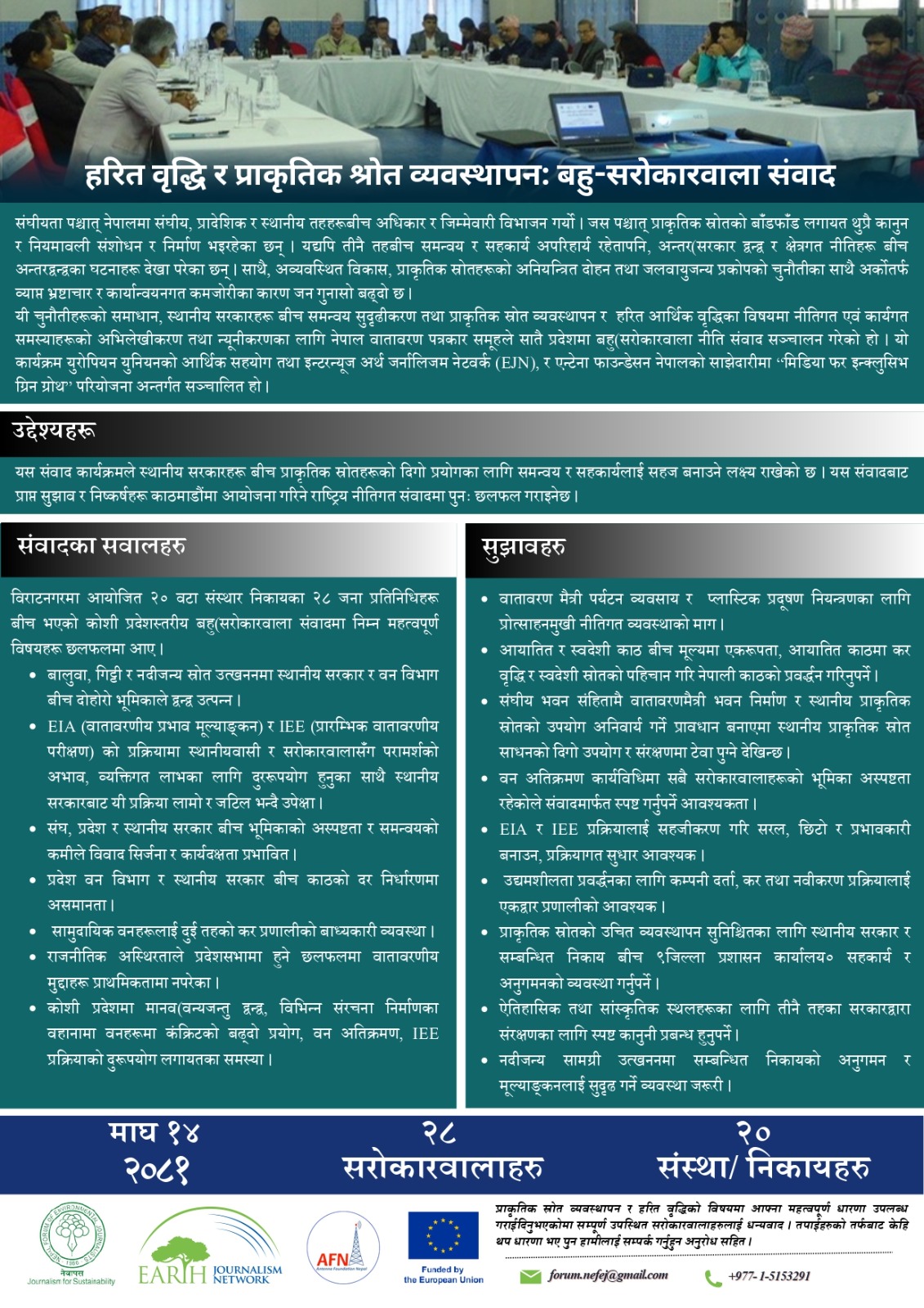 यी चुनौतीहरूको समाधान, स्थानीय सरकारहरू बीच समन्वय सुदृढीकरण तथा प्राकृतिक स्रोत व्यवस्थापन र हरित आर्थिक वृद्धिका विषयमा नीतिगत एवं कार्यगत समस्याहरूको अभिलेखीकरण तथा न्यूनीकरणका लागि नेपाल वातावरण पत्रकार समूहले सातै प्रदेशमा बहु-सरोकारवाला नीति संवाद संचालन गरेको हो । यो कार्यक्रम युरोपियन युनियनको आर्थिक सहयोग तथा इन्टरन्यूज अर्थ जर्नालिजम नेटवर्क (EJN), र एन्टेना फाउन्डेस न नेपालको साझेदारीमा “मिडिया फर इन्क्लुसिभ ग्रिन ग्रोथ” परियोजना अन्तर्गत सञ्चालित हो ।